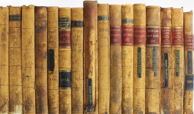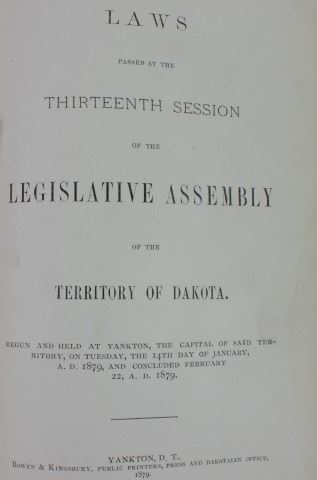 law books, includes 1879 with acts for Dakota Hospital for insane, Territorial Prison, Opium Smoking, Deadwood Fire Warden and more, 1881,1883, 1885, 1887, 1891, 1891, 1893, 1895, 1897, 1899. Frawley Estate item. Est. 250-500