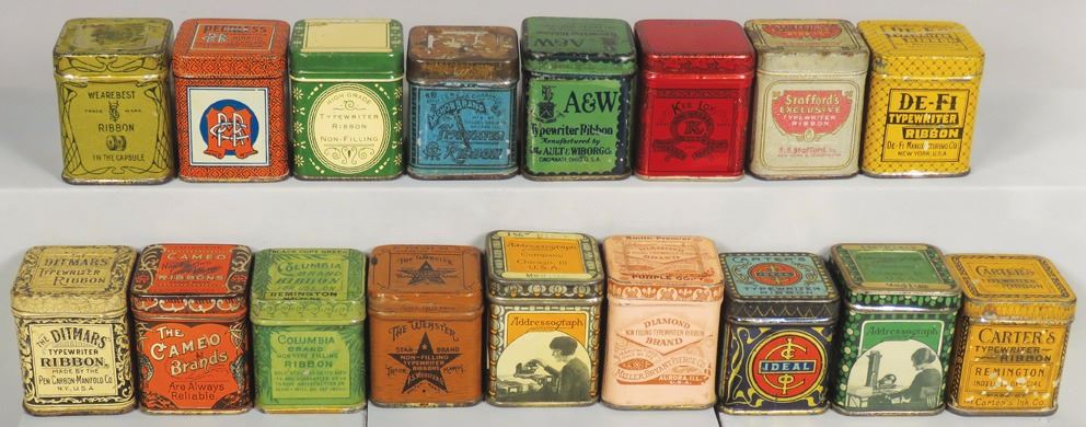Collection of 17 Early Cube Typewriter Ribbon Tins including Cameo, Ditmars, Carter's, Stafford's, Diamond Brand and more. Overall fair to very good condition. 2 X 1 3/4 X 1 1/2 inches.