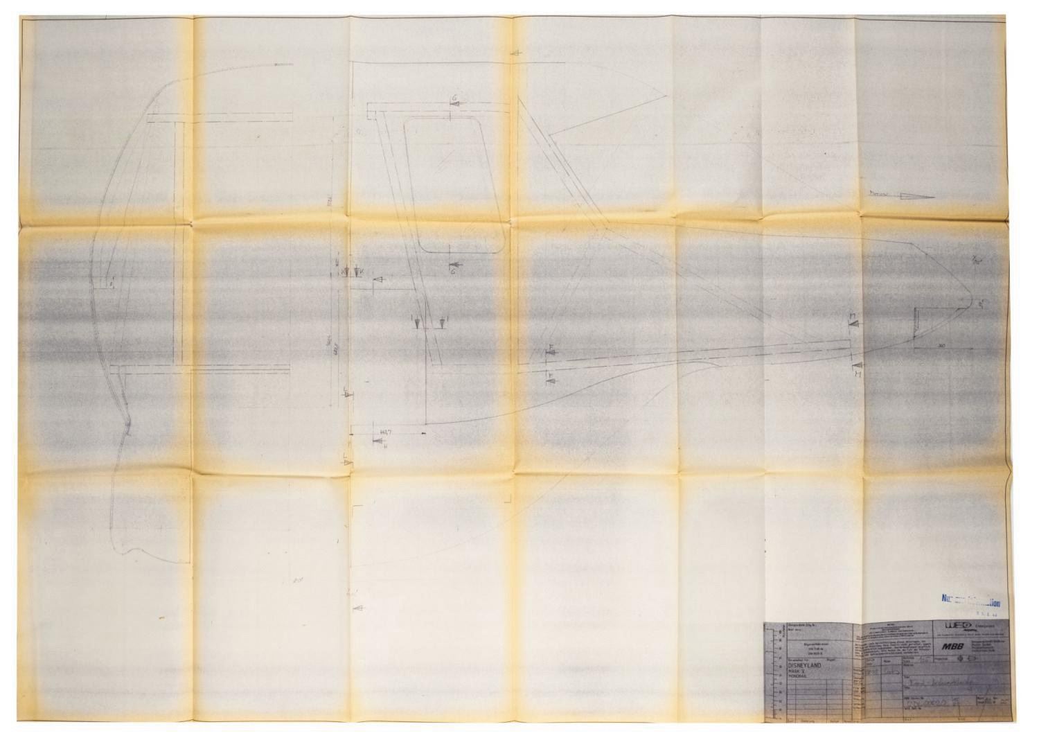 (Disneyland, 1985) A collection of (17) printed schematic renderings used in the production of the Monorail Mark V trains for Disneyland. The new trains were designed by George McGinnis of WED Imagineering Enterprises, and the parts were researched, engineered, and manufactured by outside contractor Messerschmitt-Bolkow-Blohm. The renderings contain a wealth of information, including details on panels, seats, floors, and more of the Monorail Mark V. Measuring various sizes between 32"x46.25" and 11"x17", the printed renderings display in very good condition, exhibiting mild toning and handling wear.