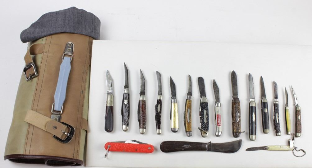 Collection of 17 pocket knives, storage case and Pocket knife collectors book.and Pocket knife collectors book.