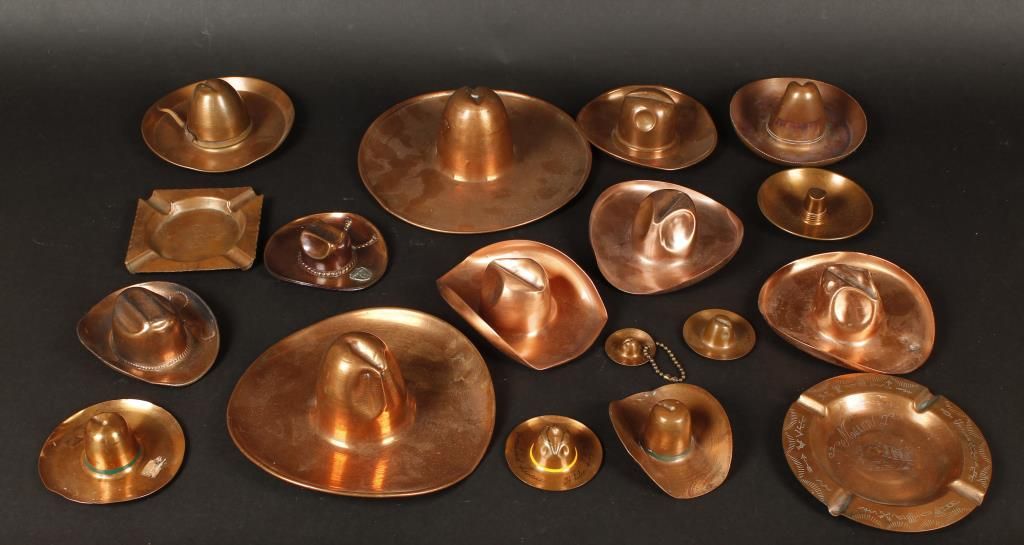 Circa 1950's. Hats of various sizes and designs. (1) Marked "1950 Prevuz Products Inc". (1) Gregorian. (1) With New Mexico emblem on rim. (1) Small hat on key chain. And (12) other hats. (1) Ashtray with buffalo. (1) Ashtray marked "Mason", with mountain scene in center and Native American symbols around edge.