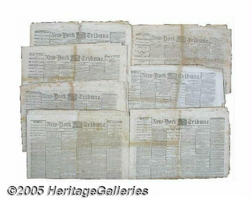 <B>Collection of 1865 Abraham Lincoln Assassination Newspapers</B></I> Seven different copies of the <I>New York Tribune</B></I> issued following the assassination of Abraham Lincoln. All have appropriate black mourning borders. The dates are: April 18, 19, 21, 22, 24, 26, 27, 1865. The papers contain vital news regarding developments in the Civil War, news of the assassination, Lincoln's funeral, the pursuit of the conspirators, "Movements of the Assassin," Secretary Seward's recovery, the surrender of Mobile, etc. Typical wear, but generally in fine condition or better. Lot:258