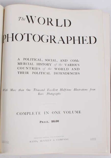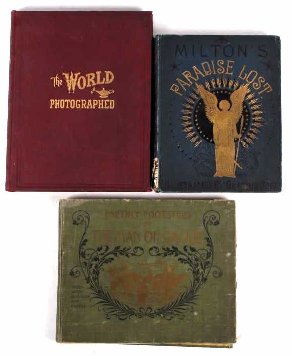 These include: 1906 The World Photographed with more than One Thousand Excellent Half-tone Illustrations from Rare Photographs Engraved, Printed, and Published by Rand, McNally & Company (in great condition),Milton's Paradise Lost Ilustrated by Gustave Dore Edited with noted and a Life of Milton by Robert Vaugh, D.D. New York, London and Paris Cassell & Company Limited, and the last book being Earthly Footsteps of The Man ofGalilee Two Hundred and Sixty-Six Original Photographic Views Anaconda Standard, Anaconda Montana 1894 Thompson Publishing (Binding separated, but goo graphics).