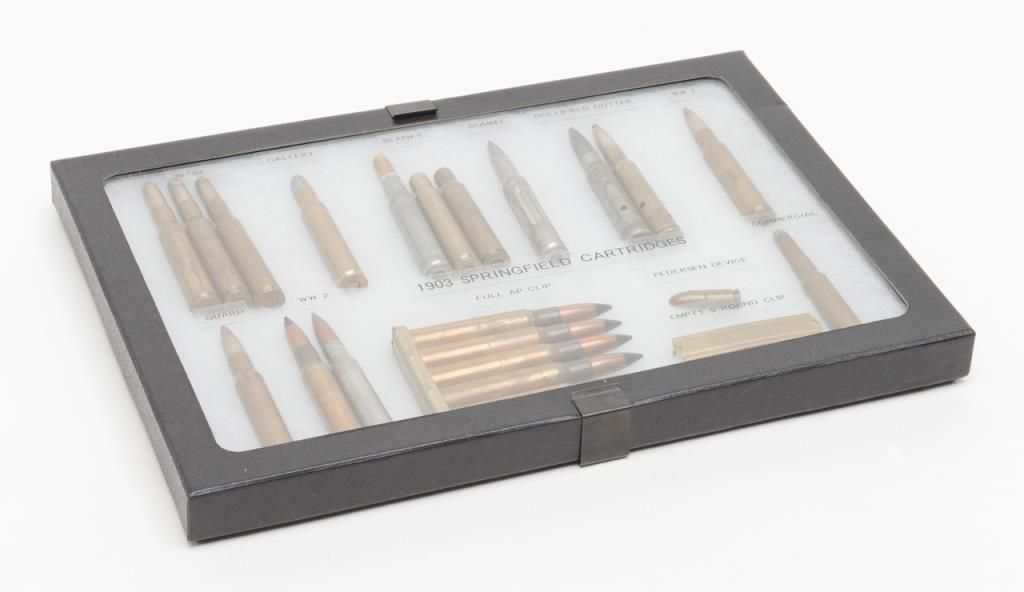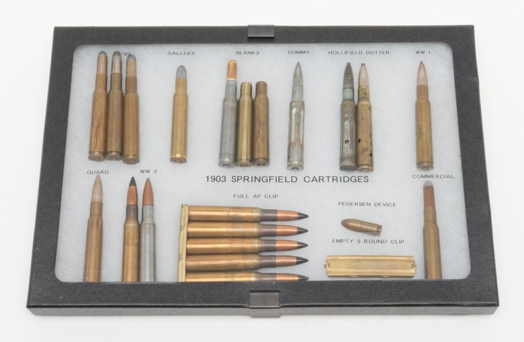 Collection of 1903 Springfield cartridges in museum quality display with ID label; shows .30-03, blanks, dummy, Hollifield Dotters (2), WW I, WW II, Full Clip, Pedersen round and clip, Commercial; 18 pieces. Est.: $250-$500.