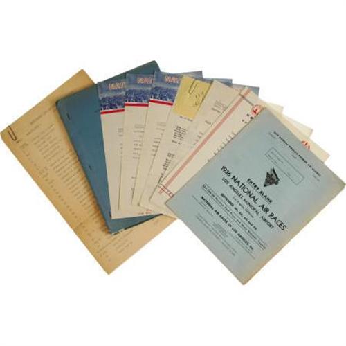 <B>Collection of 1935 National Air Races Programs and Related Ephemera.</B></I> The lot includes two copies of the schedule of events for the race, 8.75” x 11.25”, magazine format, 17 pages, containing the entry requirements for the race, with some rust to the binding staples, else very good condition; one copy of the official log of the race, 9” x 12”, magazine format, 52 pages, being a program of the events of the race with wonderful period advertisements throughout, slightly worn on the covers else very good condition; a copy of the <I>Official World, International and American Air Records, Corrected to 1935,</B></I> 8.75” x 11.5”, 48 pages, staple bound, covers tatty at the edge, else very good condition; and a varied assortment of aviation ephemera including advertising rate cards from the 1935 National Air Races. <I>From the collection of Cliff Henderson.</B></I><BR><BR><b>Shipping:</b> Books & Catalogs (<a target="_blank" href="http://www.heritageauctions.com/common/shipping.php">view shipping information</a>)