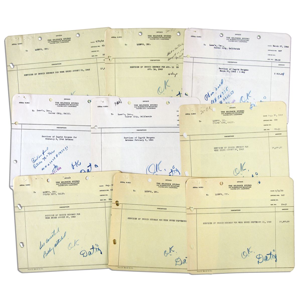 Collection of 9 invoices detailing payment to Ingrid Bergman from The Selznick Studio, dated 1943-44. David O. Selznick is the producer credited in boosting the star's career with a series of leading roles, and payments are made to Loew's Inc. in Culver City, then the distribution arm and parent company of MGM Studios. Each receipt has a variation of ''Services of Ingrid Bergman for week ended September 11, 1943'' printed with dates ranging from 1943-44 and amounts ranging from $1,750 - $17,500 for either daily or weekly work. With notes in blue pencil in an unknown hand, each with ''O.K.'' validating receipt. Yellow receipts with rounded edges measures 8'' x 7'' with two holes punched on top and left, and staple holes to top left. Overall very good condition.