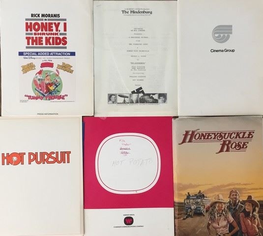 Collection of 6 press kits with black and white publicity stills included with each, sized mainly 8x10's, from various movie studios. (1970's-80's). From Buena Vista Pictures "Honey I Shrunk The Kids" (1989) includes 6 stills. From Walt Disney Pictures "Tummy Trouble"(1989), no still included with this kit. From Universal Pictures "The Hindenburg" (1975), no stills with this kit. From Paramount "Hot Pursuit" (1987), includes 9 stills. From Cinema Group "Hollywood Vice Squad" (1986) 7 stills included. From Warner Brothers Hot Potatoe"(1976), 1 stills included. From Warner Brothers "Honeysuckle Rose" (1980), includes 10 stills.