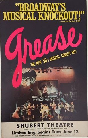 1977 THEATRE WINDOW CARD POSTER for GREASE, PRE- OPENING POSTER, SHUBERT THEATER IN LOS ANGELES. This is an original poster and not a reproduction.