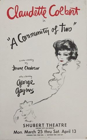 Window card for the 1973-74 pre-Broadway touring production of Jerome Chodorov's comedy "A Community of Two" which starred Claudette Colbert, George Gaynes, Peter Adams, Mary Case, Sylvia Daniel, Lou Gilbert, and David Winn. The show was a modern farce set in New York, in which Miss Colbert played a divorcee who flirts with a gentleman across the landing.
