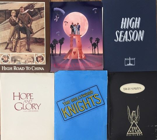 Collection of 6 press kits with black and white publicity stills included with each kit, sized mainly 8x10's, from various movie studios. (1980's-90's). From Columbia Pictures "Hope and Glory" (1987), includes10 stills". From Warner Brothers "High Road to China" (1983), includes 8 stills. From Castle Rock Entertainment "Honeymoon In Vegas"(1992) includes 8 stills. From Nelsom Entertainment "High Season" (1988), includes 2 stills. From Columbia Pictures "The Hollywood Knights" (1980), includes ~25 stills. From Tri Star Pictures "High Sprits" (1988), includes 13 stills.