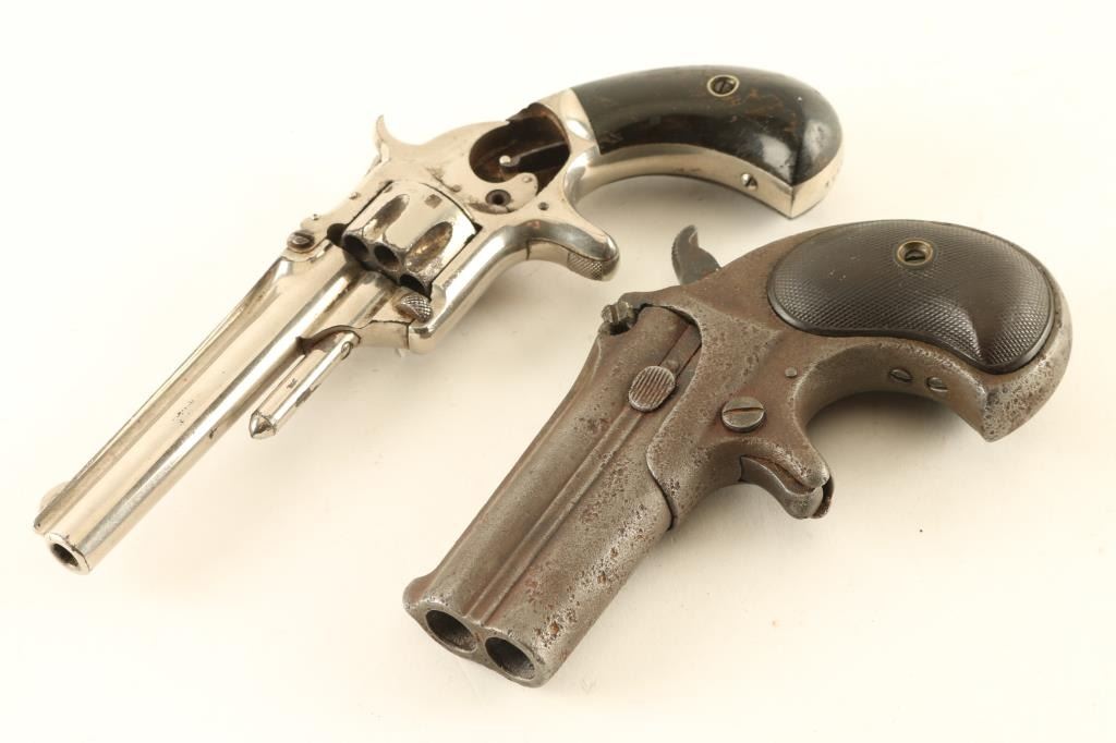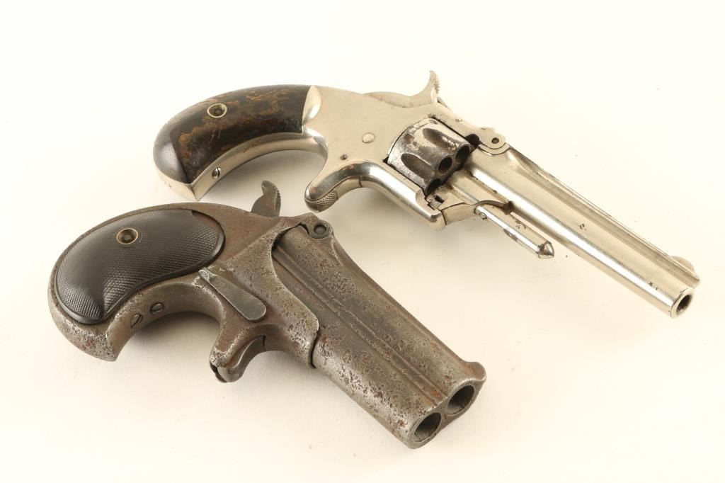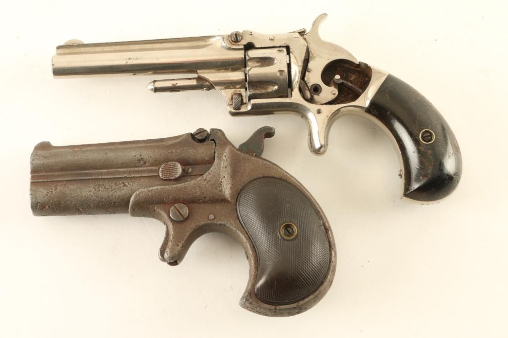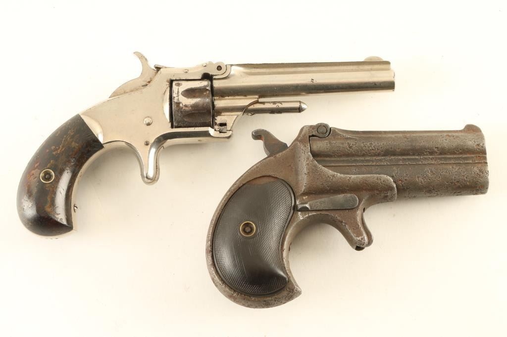 Lot of (2) pistols for display or repair only. #1) Remington Type 95 Double Derringer .41 RF SN: 336 circa 1888-1898. Bores are dark with some visible rifling. Hinge is broken at frame, with broken piece present. Hammer cocks and trigger releases, lever seems to work properly. Metal surfaces are an even pitted brown color. Grips are fair condition with missing chips. Condition is NRA Poor - broken hinge *** Antique Firearm *** #2) Smith & Wesson Model 1 Third Issue .22 Short SN: 70612 circa 1868-1881. Single action revolver with tip-up barrel, spur trigger, cylinder is removed to load/unload, nickel finish, gutta percha grips. Bore is dark with visible rifling. Nickel finish is poor to fair with peeling & chipping, brown patina in cylinder flutes. Missing sideplate. Grips are good condition. Hammer cocks and rotates cylinder, trigger releases the hammer but allows cylinder to rotate slightly out of position. Single line barrel address is crisp. Condition is NRA Poor - missing parts *** Antique Firearm ***