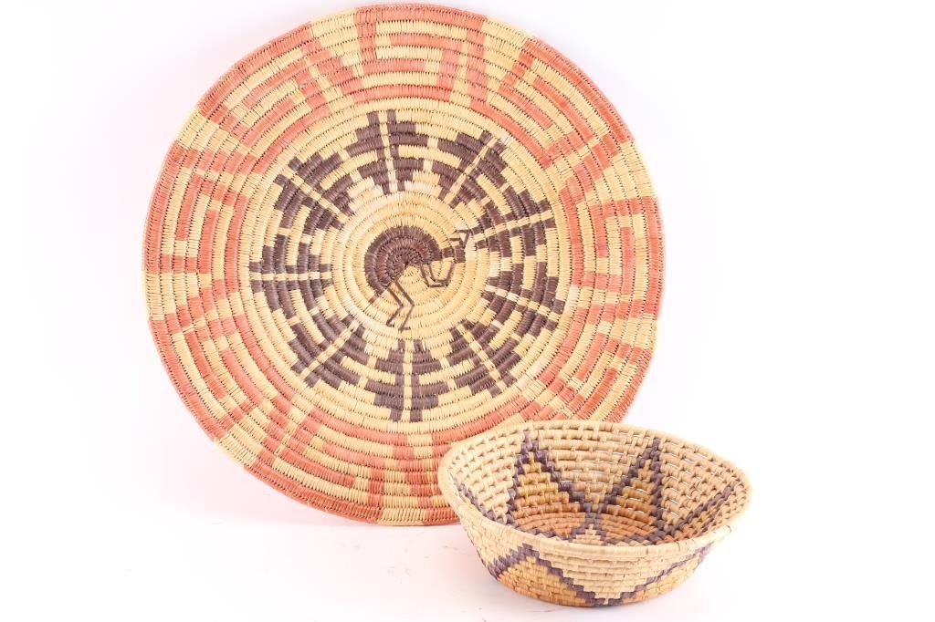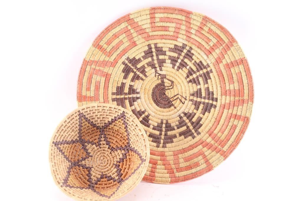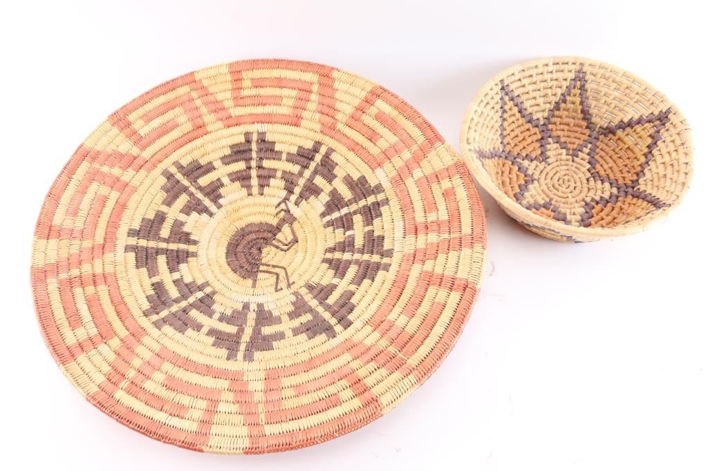 Larger kokopeli meal tray, 3 tone, 20" diameter, excellent condition; and a Navajo star basket, measures 11" diameter.