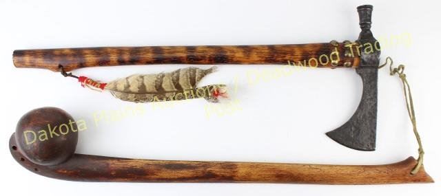 Contemporary iron head tomahawk, 20" long with file burnt and tacked haft, Wooden ball club, 23" long. Est. 200-300