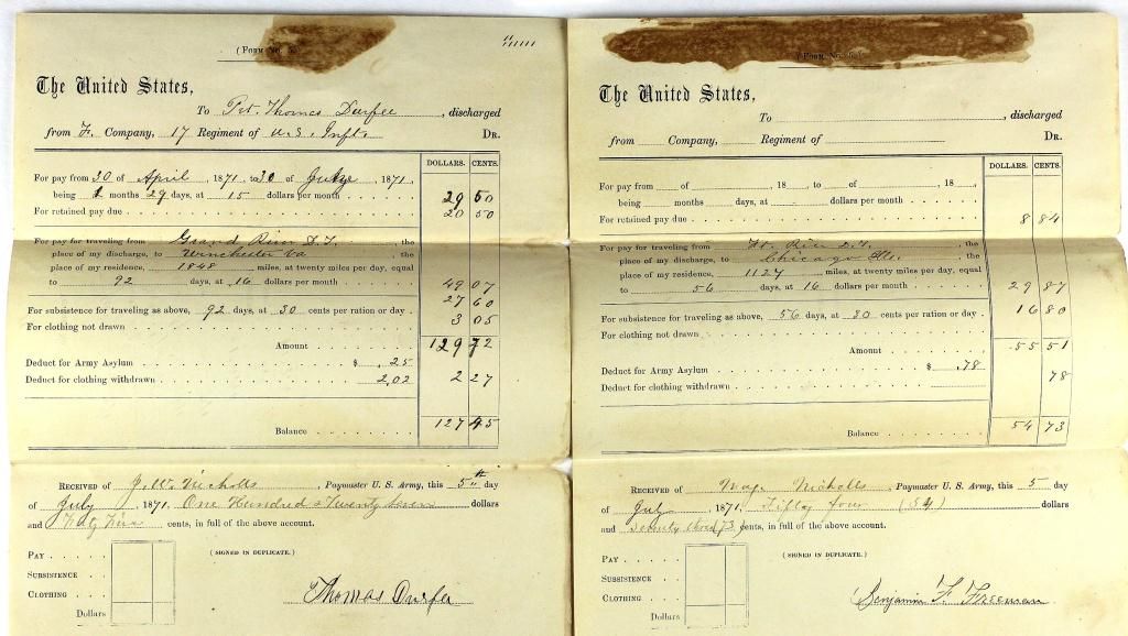 Collection of 2 Dakota Territory Discharge papers, the first for Private Thomas Durfee F Company 17th Regiment from Grand River Dakota Territory July 1871 the second Benjamin Freeman from Fort Rice Dakota Territory July 1871. Both remain in excellent condition with double fold lines and light foxing, a terrific addition to any Dakota military collection. Est. 250-450
