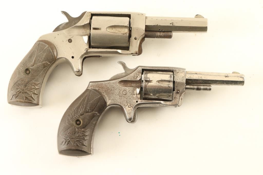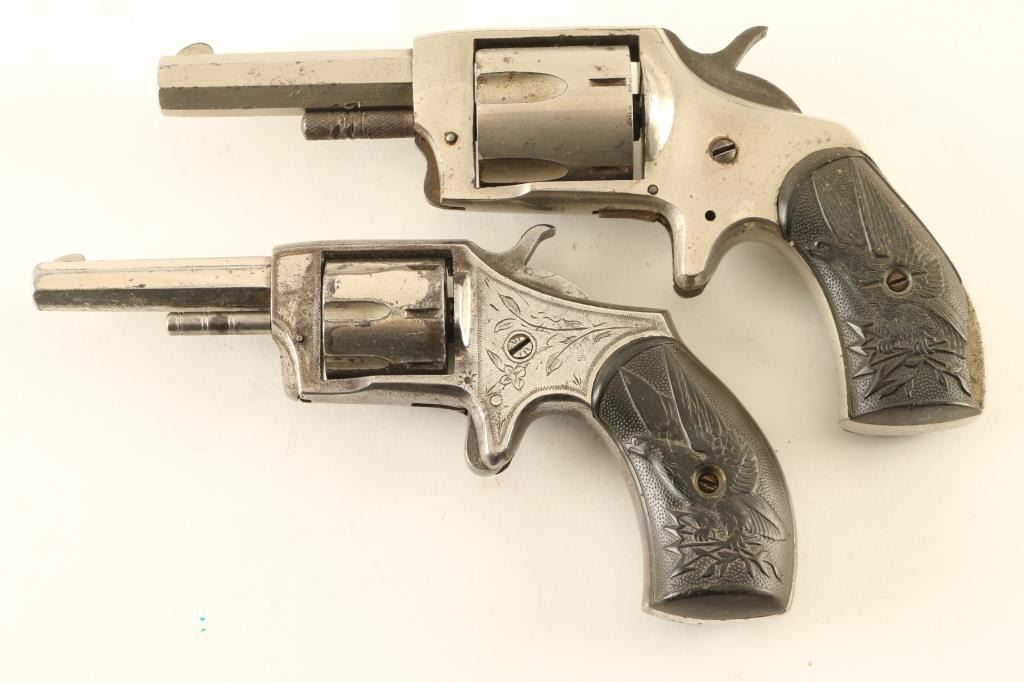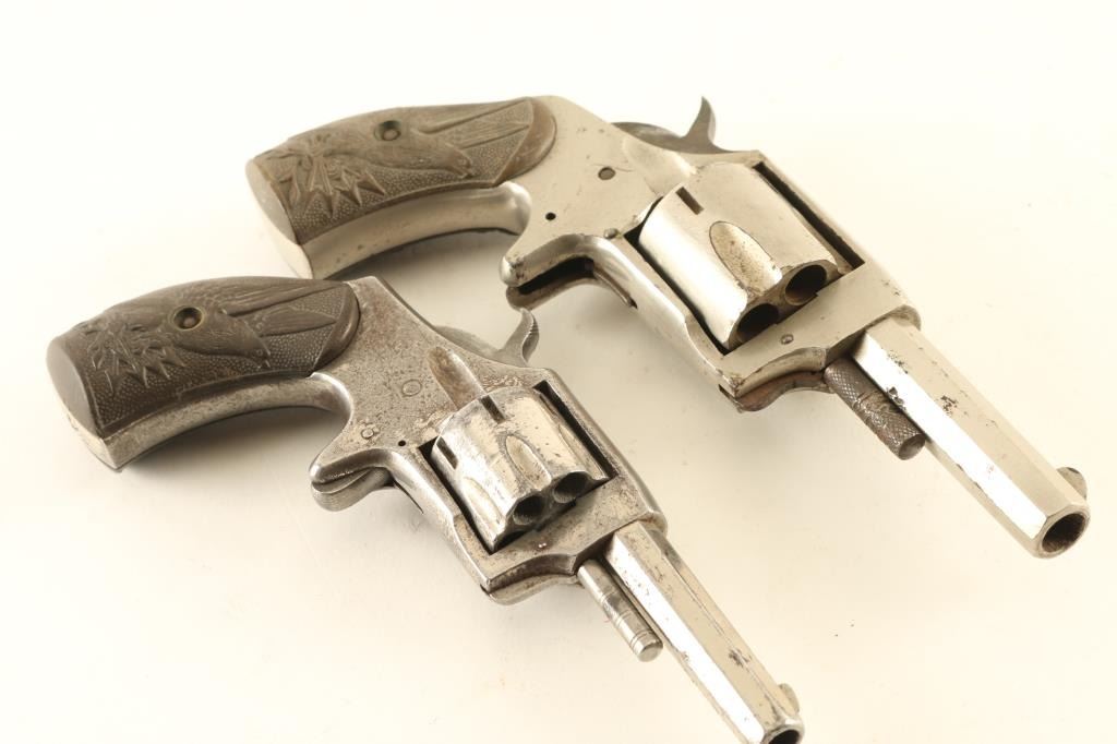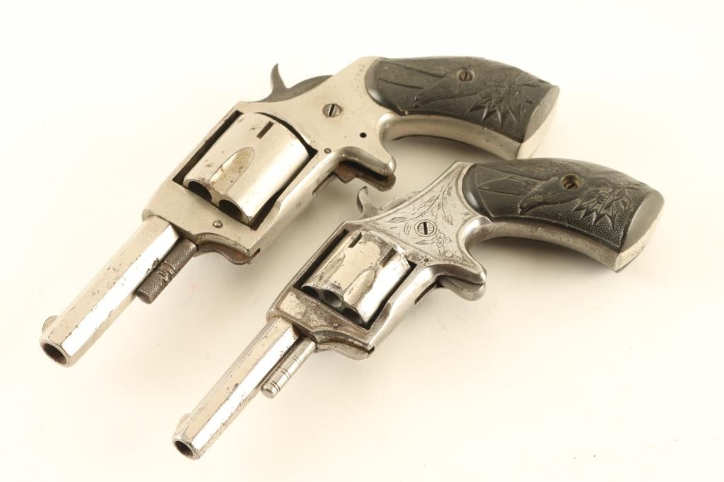 Lot of two revolvers: "DEFENDER" manufactured by Johnson & Bye circa 1873-1888, "DEFENDER 89" manufactured circa 1889-1899. Both are nickel plates, single action, octagon barrels, spur triggers, black gutta percha grips. Bores are poor condition, actions do not function properly. Nickel finish is peeling or absent, bare metal mostly cleaned to match. Defender shows more brown patina. Defender 89 has large piece missing from left grip panel. Condition is NRA Fair - for Display Only *** Antique Firearm ***