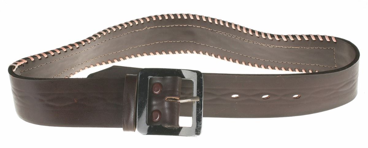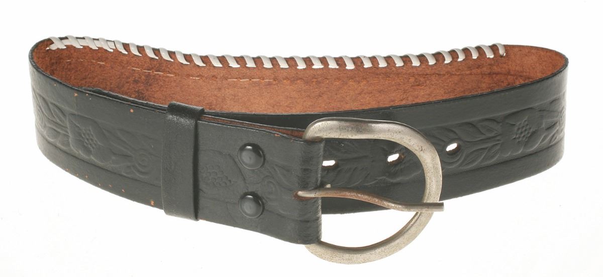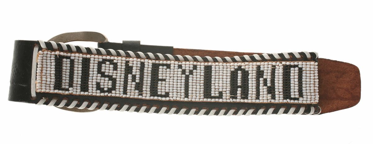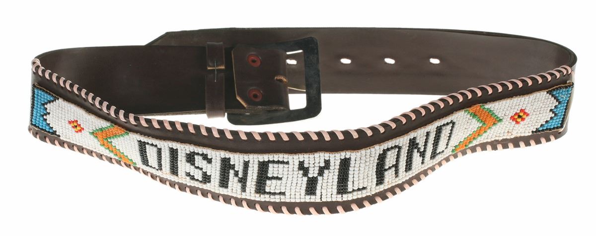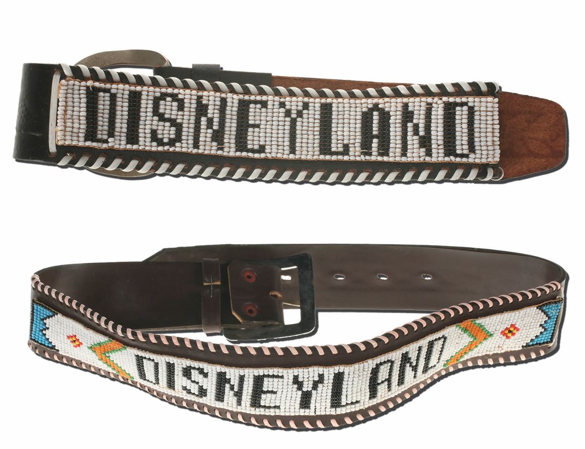 (Disneyland, 1960s) Collection of (2) black leather belts with beaded "Disneyland" lettering product samples from the collection of Jack Olsen. The beaded text has been separated from one of the belts. Belts measure 25" and 31" long. In fair to good condition with some wear throughout. In the mid-1950s, when Disneyland was nearing completion, a problem arose with park merchandise. Disney had an existing Merchandising Division in New York that operated under principles established by Disney’s Merchandising Executive Kay Kamen in the 1930s. However, Disney’s method had generally been to grant companies the rights to use Disney characters on their existing merchandise. For the new park, the need arose for products which had no existing licensee.
