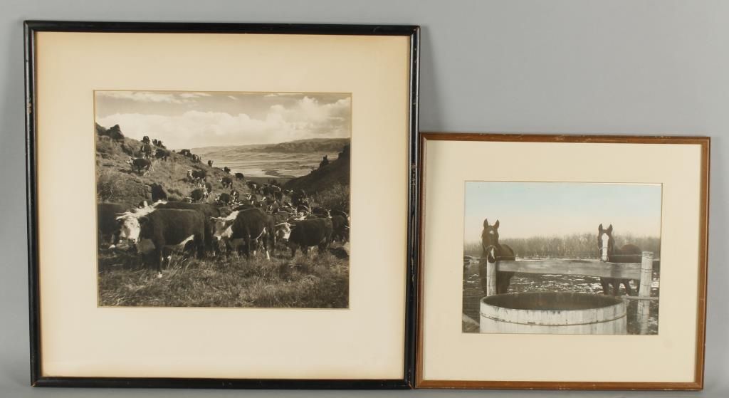 1 depicting a cattle train, and 1 of two horse at a watering hole. Both are hand colored in period frames.