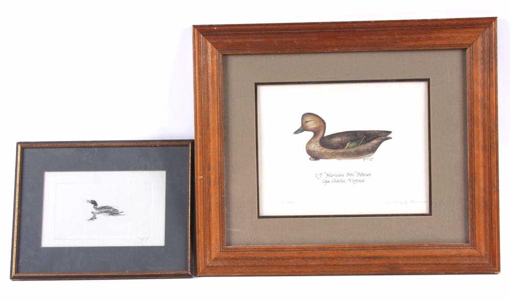 Collection of 2 Fine Art Prints Including an artist proof entitled "Sound of the North Country" signed by Sammy Scott in the lower right hand corner 10"x6 1/2", and a limited edition fine art print #776/5000 by Thelma Peterson signed lower right hand corIncluding an artist proof entitled "Sound of the North Country" signed by Sammy Scott in the lower right hand corner 10"x6 1/2", and a limited edition fine art print #776/5000 by Thelma Peterson signed lower right hand corner depictinga duck decoy, image size is 13 1/2"x10 1/2" double matted and framed.