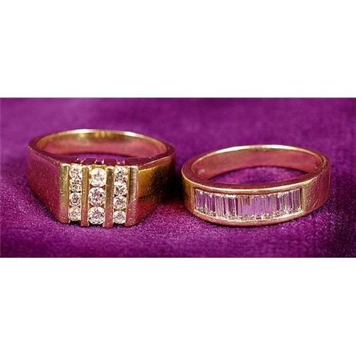 <Our item number 141144><B>Collection of 2 Gents Diamond, 14K Yellow Gold Rings.</B> Including one band style ring, featuring nine baguette-cut diamonds, weighing approximately 1.00 carat, gross weight 7.20 grams, ring size 10 1/2 and one ring featuring three rows of channel set round full-cut diamonds, all eleven weighing a total of approximately .80 carat, gross weight 12.20 grams, ring size 11. <BR>Estimated Value $1,200 - 1,400. <BR><BR>Our item number 141144<BR><IMAGES><P ALIGN="CENTER"><IMG SRC="http://www.goldbergcoins.net/liveauction/49jpegs/141144.jpg"> </P></IMAGES>