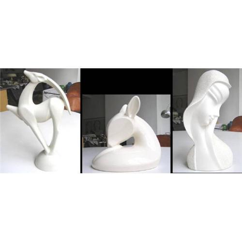 Included here are two figurines (antelope and female bust entitled "Serena") believed to be made by Haeger, and one figurine (in shape of a sitting deer) believed to be by Jaru. Each is in excellent condition, with no chips, cracks or restorations. Antelope measures 21 x 13 x 5 inches and weighs an estimated 7-8 lbs. Female figurine measures 14 x 6.5 x 4.5 inches and weighs 3 lbs. Deer figurine measures 10 x 9.5 x 6.5 inches and weighs 4 lbs. There are no markings on the undersides of any piece. The title of the Serena piece is inscribed gently on the side.
