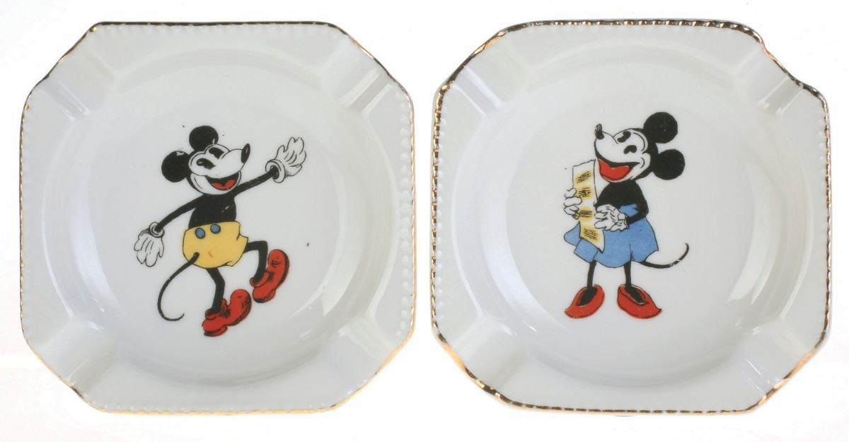 (Schuman China Company, 1932) Two Bavarian china ashtrays featuring crude images of Mickey Mouse and Minnie Mouse. Ashtrays measure 3"x3"x0.75". In very good condition with minimal paint wear to the images and small amounts of scuffing.