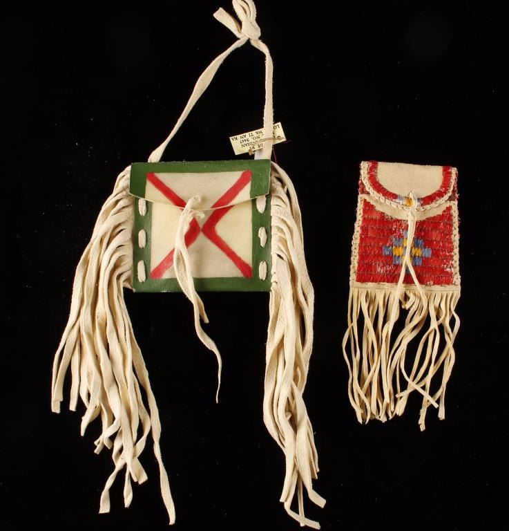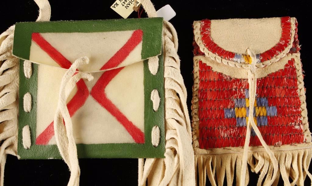 Including 1 parfleece painted bag made by the Osage Indians and 1 smaller quill embroidered bag.