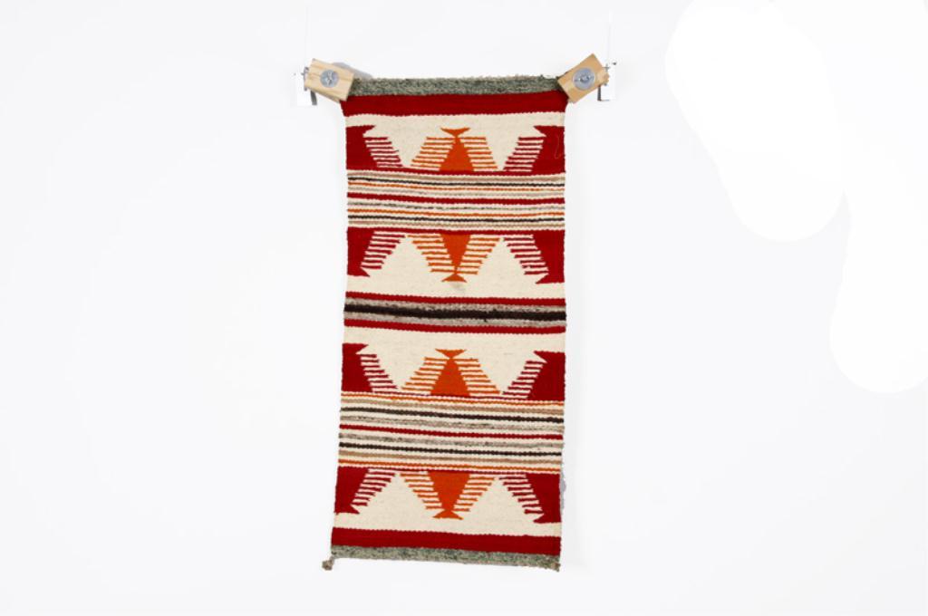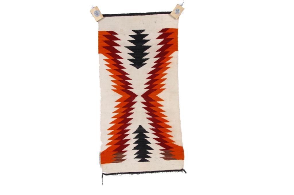 Collection of 2 Navajo Runners One with zigzag pattern in orange, black and cream which measures 39"x20", and the other has red, brown, orange, and cream with geometric design measures 34"x15". Both 1930s era.One with zigzag pattern in orange, black and cream which measures 39"x20", and the other has red, brown, orange, and cream with geometric design measures 34"x15". Both 1930s era.