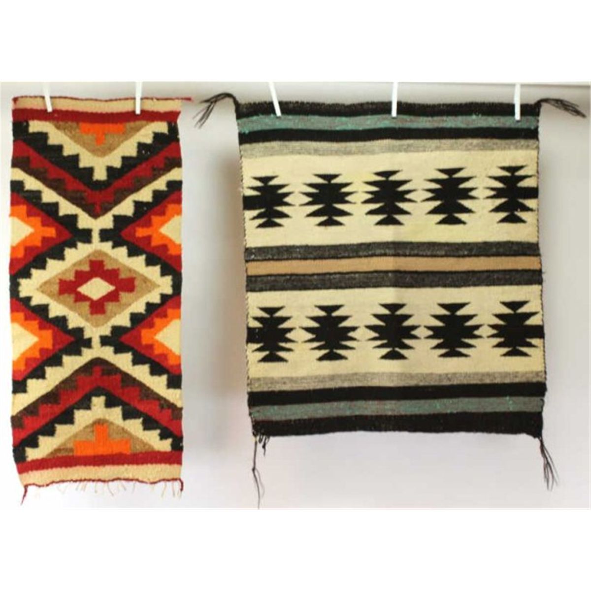 Collection of 2 Navajo rugs includes early runner 16 1/2" X 37 showing light bleed and some fray and 29" X 32" rug showing some light staining and fray.