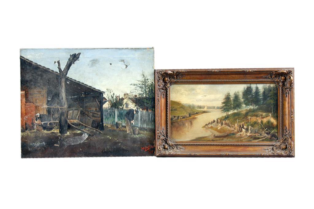 Collection of 2 Original Antique Oils One Thofmansky, dated 1899 depicting farm life, measures 22"x17 1/2", in very poor condition, and a riverside scene in original frame, measures 17"x10".One Thofmansky, dated 1899 depicting farm life, measures 22"x17 1/2", in very poor condition, and a riverside scene in original frame, measures 17"x10".