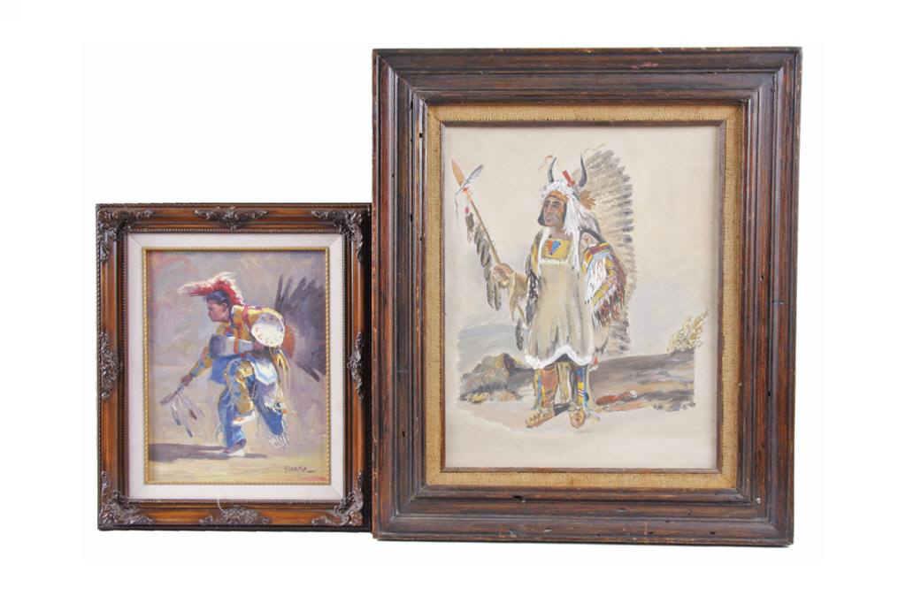 Collection of 2 Original Oil on Board Depicting Indians, one of an Indian Chief, unsigned, measures 15 1/2"x19 1/2", the other is entitled Sioux Dancer by Phil Starke, measures size is 11"x14".Depicting Indians, one of an Indian Chief, unsigned, measures 15 1/2"x19 1/2", the other is entitled Sioux Dancer by Phil Starke, measures size is 11"x14".