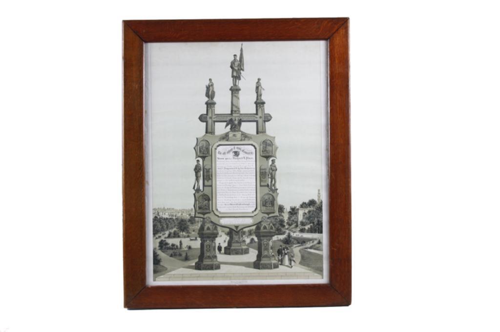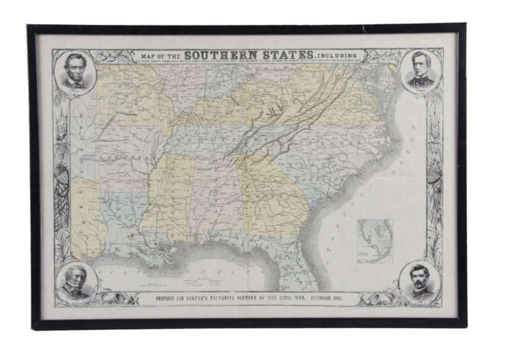 Collection of 2 Prints One is a print of an Honorable Discharge to Richard L Place of the 127th Regiment, New York Vol. Infantry, dated Sept. 8, 1862. Presented to his wife on May 30, 1896. In excellent antique oak frame. Image size is 31"x23 1/2", and tOne is a print of an Honorable Discharge to Richard L Place of the 127th Regiment, New York Vol. Infantry, dated Sept. 8, 1862. Presented to his wife on May 30, 1896. In excellent antique oak frame. Image size is 31"x23 1/2", and the otheris an antique map of the Southern states which measures 32"x22".