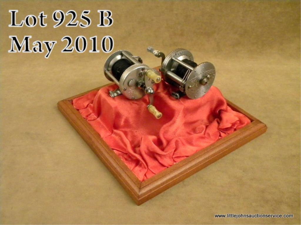 Collection of 2 Pslueger Trade Knotty Live Bait Casting reels in four-sided glass and wood display case; both reels in very good condition and displayed on rose colored fabric that contrasts nicely with the bright steel engraved reels.Est.: $150-$300.