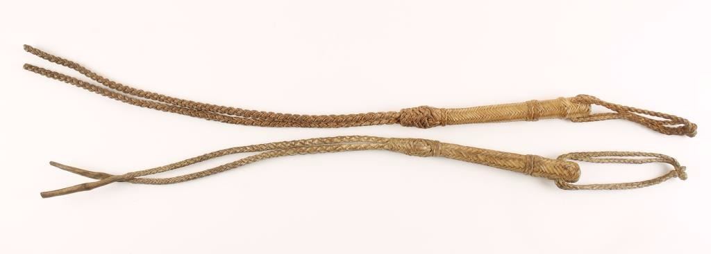 Including: (1) Rawhide braided quirt with double braided handle and double braided poppers, circa 1910 - 1920's. Measures 29" overall. In very good condition. (1) Rawhide braided quirt with double braided loop handles and double braided poppers, circa 1930's. Measures 26" overall. In good condition showing age.