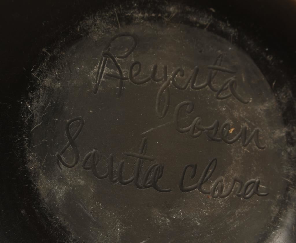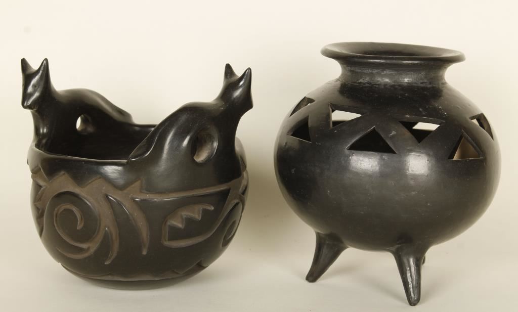 1 incised carved with fox effigies signed by Reyeita Cosen on base. 1 triangle incised carved pot with built in legs that has some minor losses to feet otherwise good.