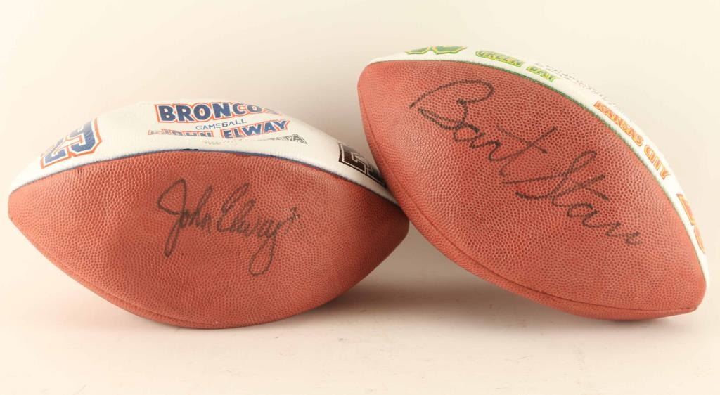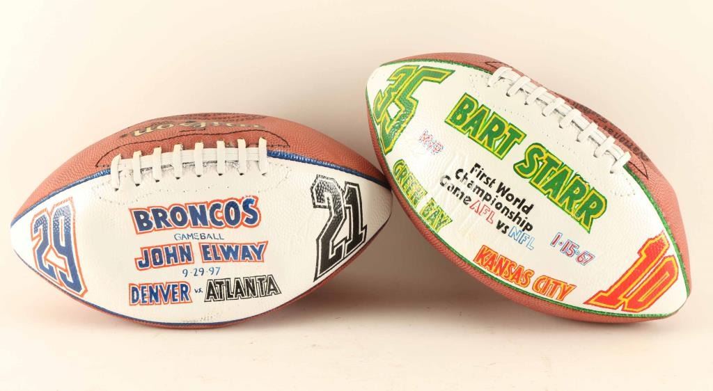 (1)John Elway signed ball on a Denver Broncos ball from reads "Broncos Game Ball John Elway 9-29-97 Denver VS Atlanta 29 21 signed in marker. (1)Bart Starr signed ball on a Green Bay Packers ball reads " Bart Starr First Worls Championship Game AFL VS NFL Green Bay Kansas City 1-15-67 MVP 35 10" signed in black marker includes letter of authenticity from Athletes Helping Kids dated February 15,200 signed by director Don Edwards stating this was one of 8 balls signed and donated. (AS IS WHERE IS WE ARE NOT SPORTS MEMBORBILLA EXPERTS)