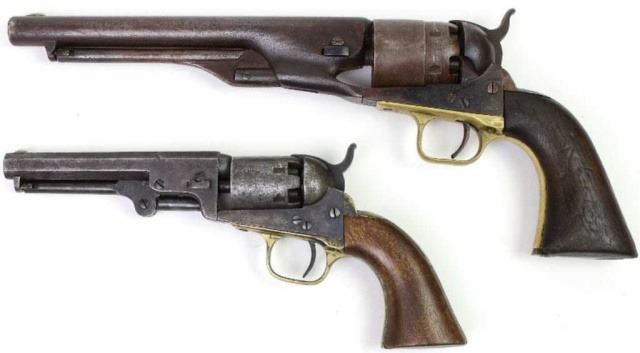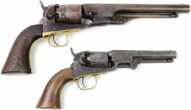 Collection of 2 antique Colt revolversincluding one Pocket 1849 .31 cal SN22XXXX 5" barrel, matching visible serial numbers, partial visible stage coach scene, action working sporadically, made in 1862, and one 1860 .44 cal. SN82XXX 8" barrel, 3 screw, novisible serials on barrel, cylinder, and backstrap, revolver is complete, put together from parts with non functioning action, made in 1862. From Dillman Ash collection. Est. 400-800