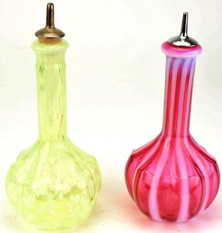Collection of 2 antique barber bottles one in vasoline glass with daisy and fern pattern, the second