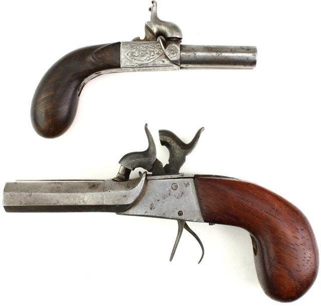 smallest unmarked with engraved box lock frame, 1 1/2" barrels, folding triggers and rosewood stock, functioning actions and condition. Larger pistol unmarked 2" octagon barrels and walnut stock cleaned to silver, non functioning actions, missing trigger guards. Antique. Est. 250-500