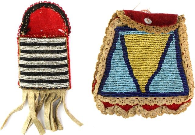 Cheyenne, beads in black and white, fringed bottom, 2 1/2" X 5". Nothern Plains bag beaded in yellows and blues, trimmed in white lace all on early red trade cloth, 5" X 5". Est. 350-600