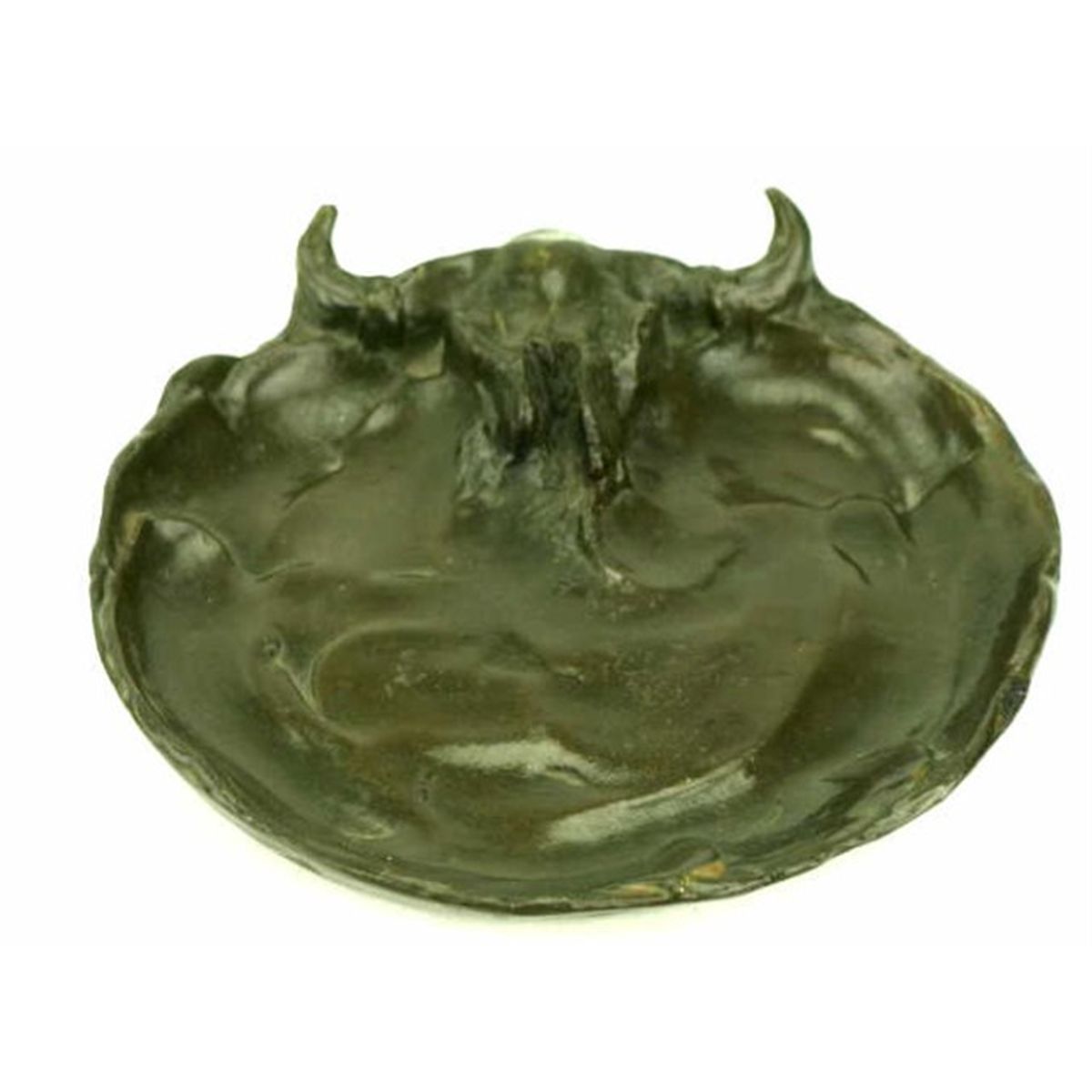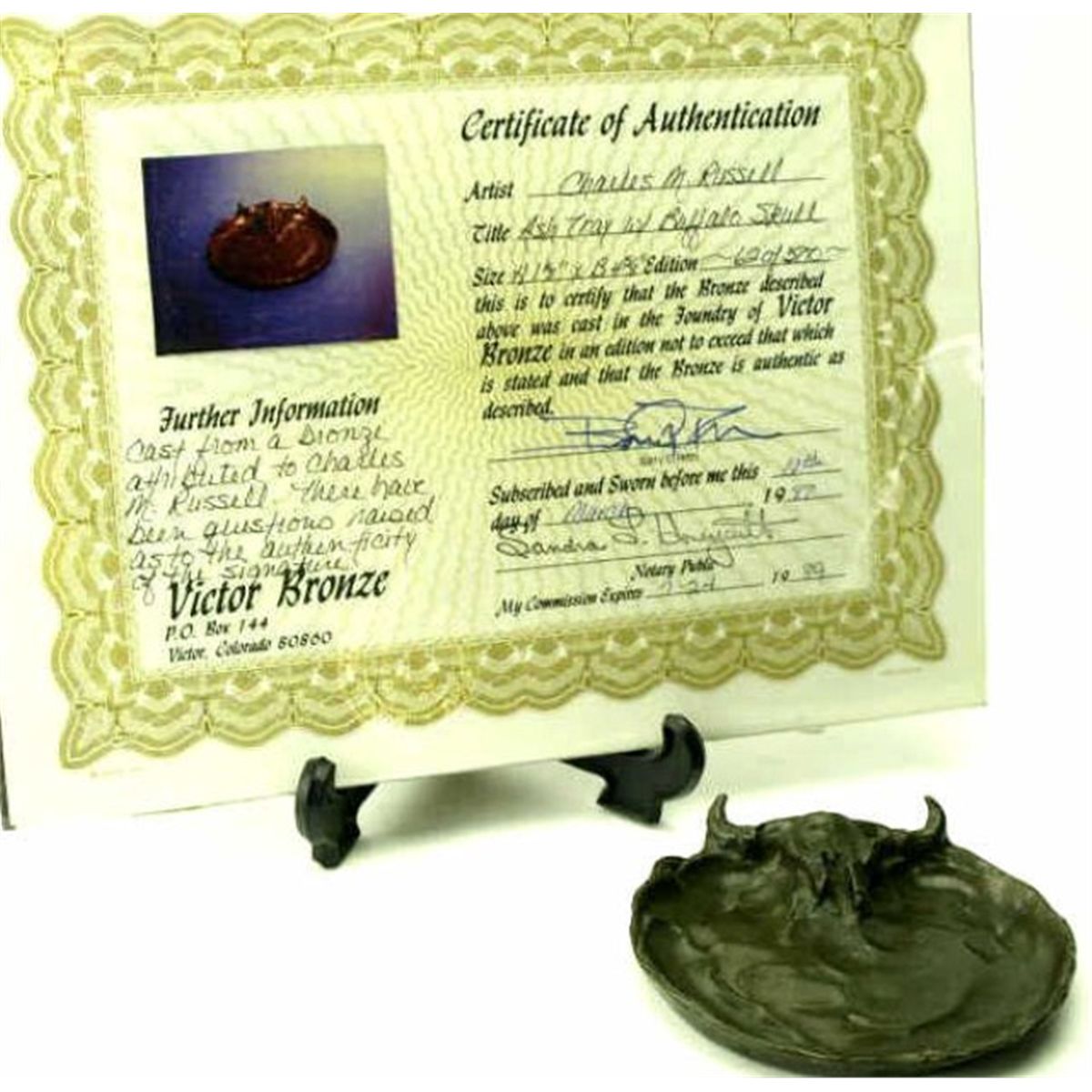 Collection of 2 bronzes including Re cast buffalo skull ashtray by CM Russell, with certificate, cast by Victor Bronze, 4 1/2" and Original bronze by Nancy McLaughlin of Plains Warrior, 6" tall, #13/75.