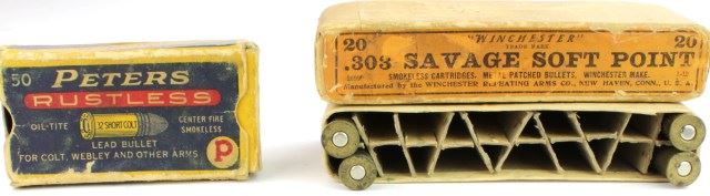 including Winchester .303 Savage Soft Point with 4 rounds, and empty Peters Rustless .32 Short Colt. Est. 50-75