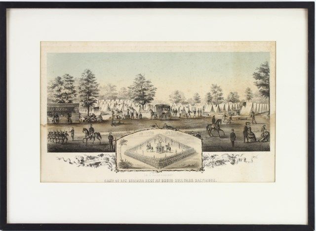 Reg Period Indian Volunteers, First Heavy Artillery including Soldiers Memorial, framed, image 17 1/2" X 22" and Camp of 21st Indiana Reg at Druid Hill Park Baltimore, framed, image 11" X 18". Est. 250-500
