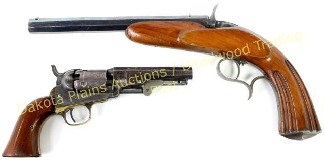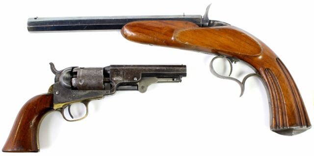 Collection of 2 firearmsset includes 1 Colt 1849 .31 cal. SN11XXXX revolver, 4" barrel, blued and case hardened finish with walnut grips, action does not function, the condition otherwise very good, all visible serial numbers matching,also included is 1 European 19th century unmarked parlor pistol, 8 3/4" blued barrel and walnut stock, engraved hardware with good functioning action, showing fine overall condition. From Jerome Klingfus collection.Antiques. Est. 800-1400