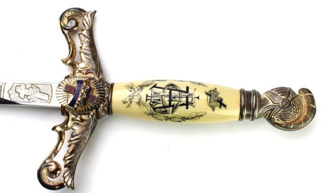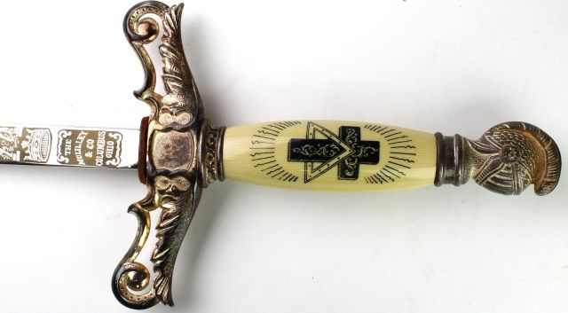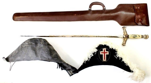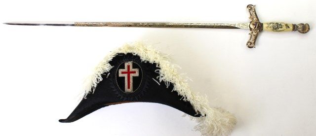 and hat. Sword with etched Edw. A. L. Griffin, made by McLilley & Co., with monogrammed faux ivory handle the guard with symbolic cross and crown. Feathered chapeau also marked Griffin, weather hat cover included. Est. 250-450