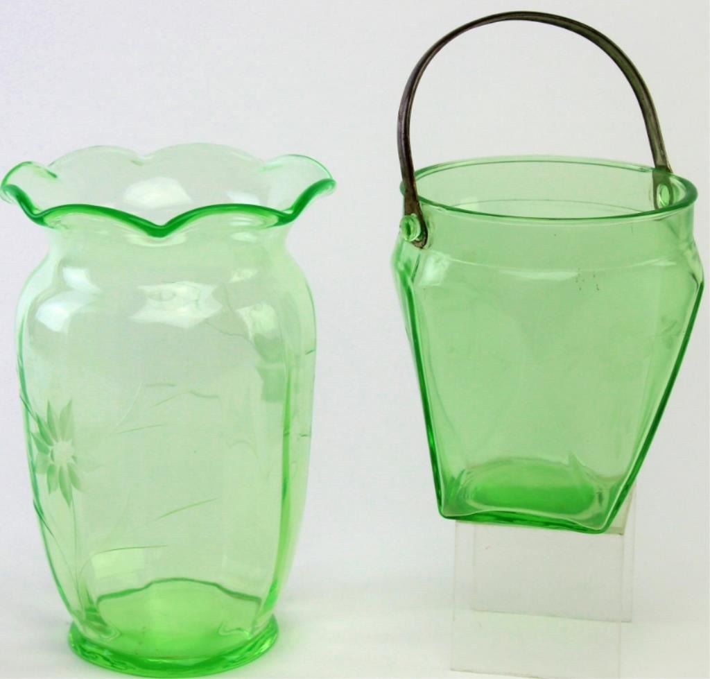 Collection of 2 good early green depression glass items, includes large vase 9" tall and metal handled ice bucket. Both with floral cut patterns, excellent condition. items, includes large vase 9" tall and metal handled ice bucket. Both with floral cut patterns, excellent condition.