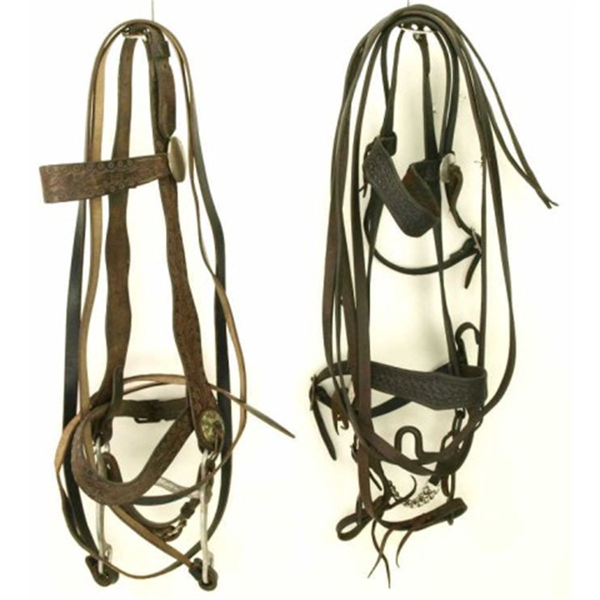 Collection of 2 headstalls with bits the first basket stamped wide check headstall unmarked iron bit, second a stamped wide check headstall and Crockett marked aluminum bit.