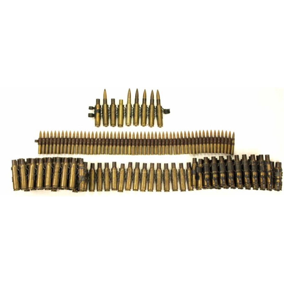 Collection of 2 includes 100 rounds of empty 50 cal. brass on linked belt, 9 feet long and 52 rounds of 30 cal. loaded cartridges on linked belt 28" long.