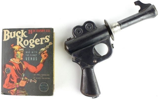 tin toy pop gun and Buck Rogers War with the Planet Venus big little book 1938. Book remains in very good condition. From the Frawley estate. Est. 100-200