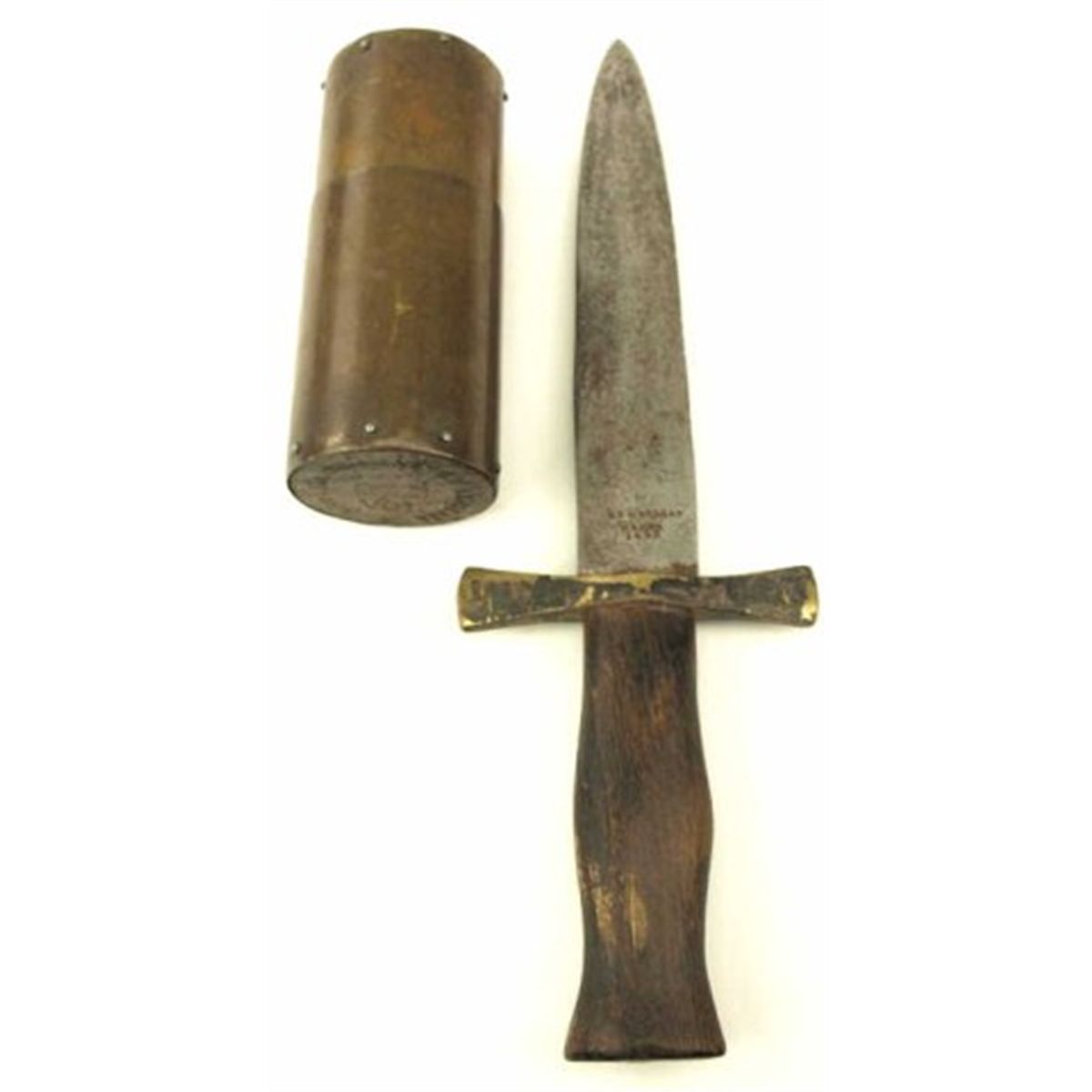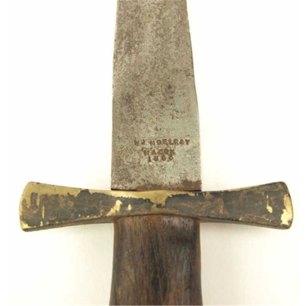 Collection of 2 includes CSA stamped brass and wood document case 5 1/2" long and spear point bowie knife stamped on blade WJ Moelroy Macon 1863, 13" long.