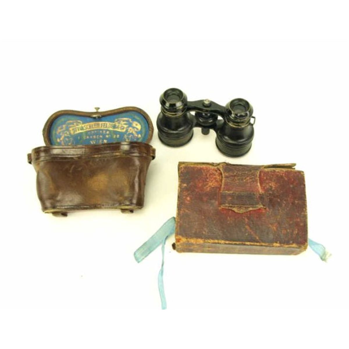 Collection of 2 includes Small leather bound bible dated 1843 printed in Portland ME 4 1/4" tall and a cased pair of opera glasses by Schleiffelder & Co with leather carry case.